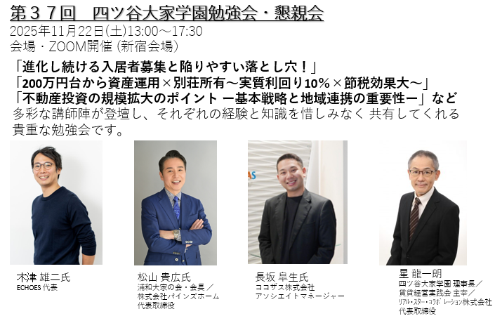 不動産投資で成功するためのヒントが満載の「四ツ谷大家学園」第37回勉強会が、2025年11月22日(土)に開催決定! 皆様のご参加をお待ちしております。